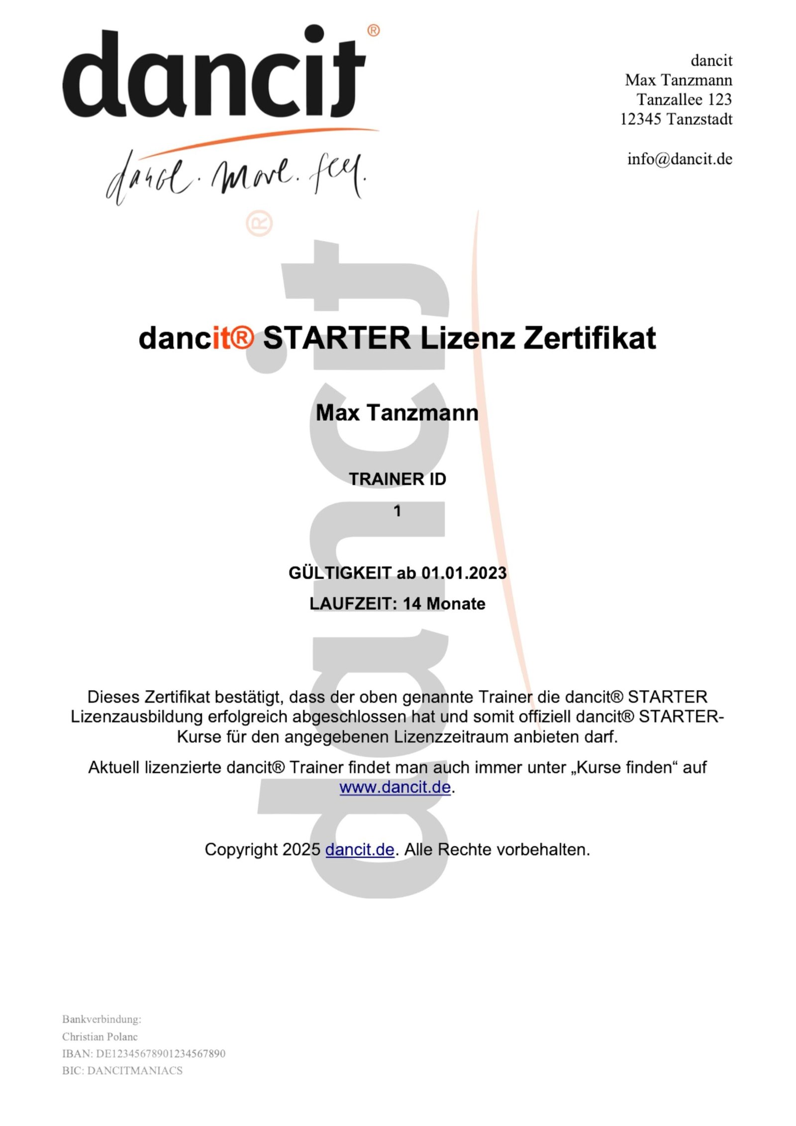Offizielle dancit®-Trainerlizenz mit 14 Monaten Gültigkeit.